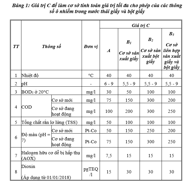 2.1. Giá trị tối đa cho phép của các thông số ô nhiễm trong nước thải công nghiệp giấy và bột giấy khi xả ra nguồn tiếp nhận nước thải (QCVN 12-MT:2015/BTNMT)